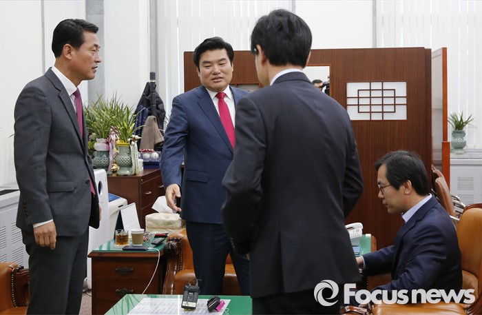 (서울=포커스뉴스) 원유철 새누리당 원내대표가 19일 오후 서울 여의도 국회에서 원 원내대표의 비상대책위원회 체제에 반대 입장을 가진 의원 및 당선인으로 구성된 당 혁신모임(가칭) 소속 의원들과 면담에 앞서 인사하고 있다. 왼쪽부터 황영철 의원, 원 원내대표, 하태경, 김영우 의원.