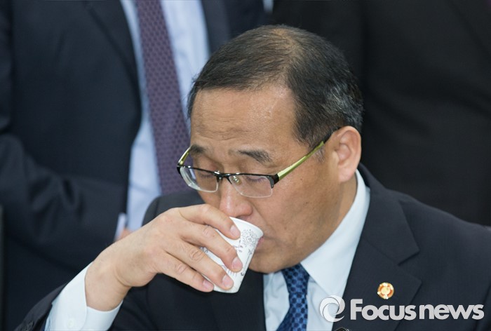 (세종=포커스뉴스) 19일 오후 세종시 정부세종청사 기획재정부 대회의실에서 열린 2016년 시도지사협의회에 참석한 홍윤식 행정자치부장관이 목을 축이고 있다.