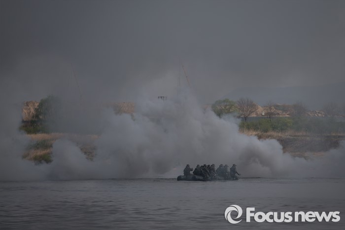 | △ K-2 흑표전차 잠수도하훈련, 연막탄 사이로 빠져나가는 보트 |