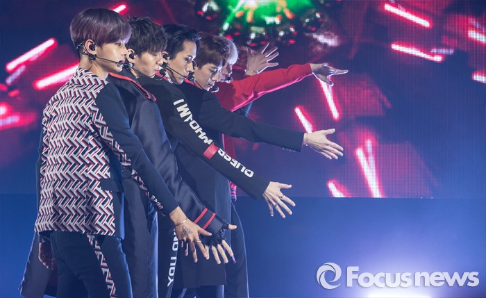 홀서울=포커스뉴스) 19일 오후 서울 마포구 롯데카드 아트센터에서 열린 아이돌그룹 VIXX의 싱글앨범 'Zelos' 발표 쇼케이스에 참여한 멤버들이 신곡 '다이너마이트'의 무대를 선보이고 있다.