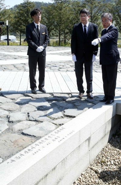 | △ 노무현 전 대통령 묘역 둘러보는 문재인-김홍걸 |