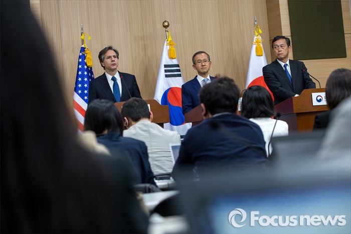 (서울=포커스뉴스) 토니 블링컨 미국 국무부 부장관이 19일 오후 서울 종로구 외교부에서 '제3차 한미일 외교차관 협의회' 결과 발표를 하고 있다.