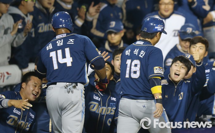 (서울=포커스뉴스) 19일 서울 잠실구장에서 열린 2016 프로야구 NC-LG 경기 4회초 1사 2,3루에서 NC 이호준의 우익수 오른쪽에 떨어지는 적시타로 헤인즈와 박석민이 홈인해 덕아웃에서 동료들의 환영을 받고 있다.