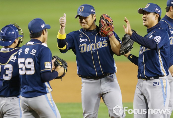 (서울=포커스뉴스) 19일 서울 잠실구장에서 열린 2016 프로야구 NC-LG 경기에서 LG에 승리한 NC 조영훈, 박석민이 투수 구창모와 하이파이브하며 기뻐하고 있다.