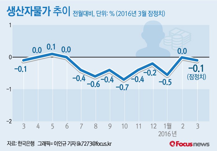 (서울=포커스뉴스) 20일 한국은행에 따르면 올해 3월 생산자물가지수(2010년 100기준)는 98.42로 전월 대비 0.1% 하락했다.