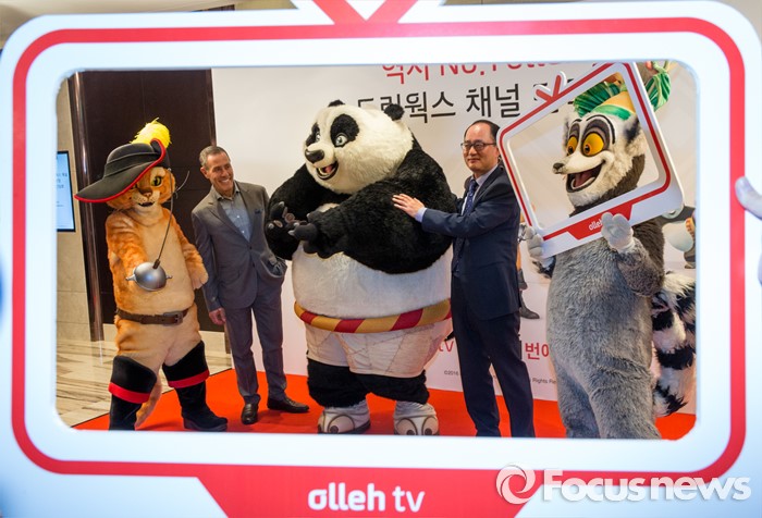(서울=포커스뉴스) 20일 오전 서울 중구 그랜드 앰버서더 호텔에서 열린 '올레tv 드림웍스 채널 출시' 기자간담회에 참석한 에릭 엘렌보겐(왼쪽) 드림웍스 해외TV사업 대표와 강국현 KT 마케팅본부장이 드림웍스 매니메이션 캐릭터 인형옷을 입은 모델들과 함께 포즈를 취하고 있다.