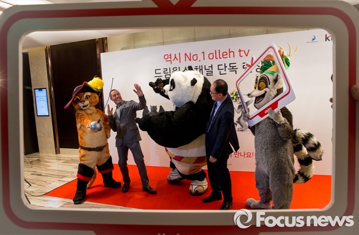 (서울=포커스뉴스) 20일 오전 서울 중구 그랜드 앰버서더 호텔에서 열린 '올레tv 드림웍스 채널 출시' 기자간담회에 참석한 에릭 엘렌보겐(왼쪽) 드림웍스 해외TV사업 대표와 강국현 KT 마케팅본부장이 드림웍스 매니메이션 캐릭터 인형옷을 입은 모델들과 함께 포즈를 취하고 있다.