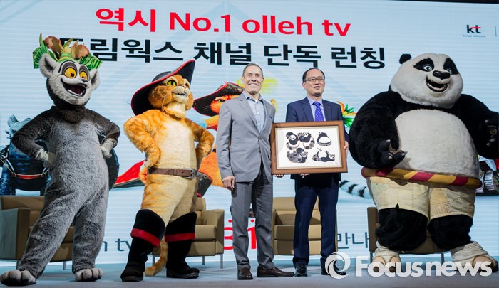 (서울=포커스뉴스) 20일 오전 서울 중구 그랜드 앰버서더 호텔에서 열린 '올레tv 드림웍스 채널 출시' 기자간담회에 참석한 에릭 엘렌보겐(왼쪽) 드림웍스 해외TV사업 대표와 강국현 KT 마케팅본부장이 드림웍스 매니메이션 캐릭터 인형옷을 입은 모델들과 함께 포즈를 취하고 있다.