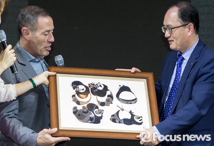 (서울=포커스뉴스) 20일 오전 서울 중구 그랜드 앰버서더 호텔에서 열린 '올레tv 드림웍스 채널 출시' 기자간담회에 참석한 에릭 엘렌보겐(왼쪽) 드림웍스 해외TV사업 대표가 강국현 KT 마케팅본부장이 애니메이션 쿵푸팬더 원화를 선물하고 있다.