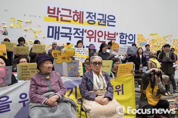 (서울=포커스뉴스) 20일 오후 서울 종로구 옛 주한일본대사관 앞에서 피해 할머니들을 비롯한 한국정신대문제대책협의회와 참석자들이 '제1227차 일본군 위안부 문제해결을 위한 정기 수요시위'를 하고 있다.