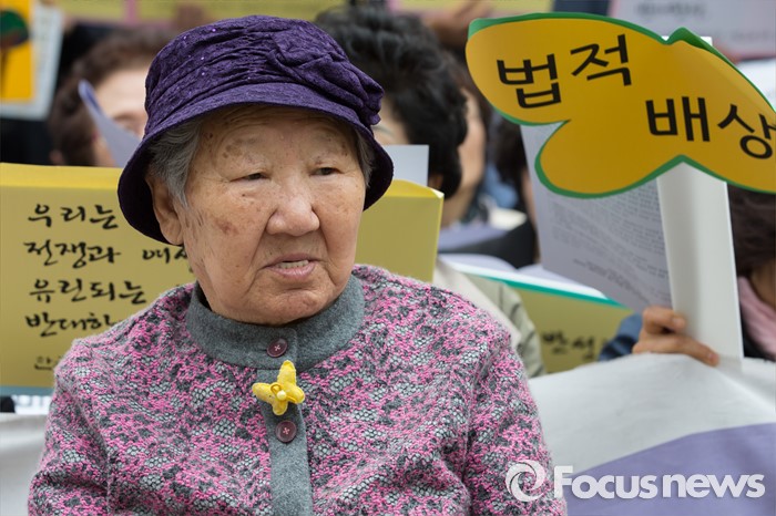 (서울=포커스뉴스) 20일 오후 서울 종로구 옛 주한일본대사관 앞에서 피해 할머니들을 비롯한 한국정신대문제대책협의회와 참석자들이 '제1227차 일본군 위안부 문제해결을 위한 정기 수요시위'를 하고 있다.