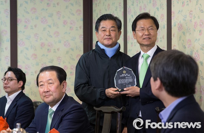(서울=포커스뉴스) 천정배 국민의당 상임공동대표가 20일 오후 서울 마포 불교방송국 지하 1층의 한 음식점에서 열린 국민의당 소속 제19대 국회의원 오찬 간담회장에 참석해 신학용 의원에게 감사패를 전달하며 기념사진을 찍고 있다.