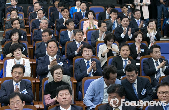 (서울=포커스뉴스) 20일 오전 서울 여의도 국회에서 열린 더불어민주당 20대 총선 당선자 대회에 참석한 당선인들이 박수치고 있다.