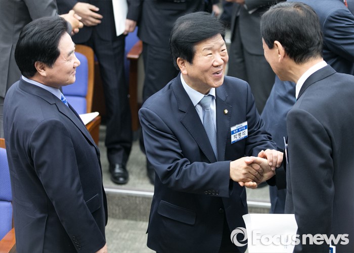 (서울=포커스뉴스) 20일 오전 서울 여의도 국회에서 열린 더불어민주당 20대 총선 당선자 대회에 참석한 이석현(왼쪽부터), 박병석, 진영 당선인이 인사하고 있다.