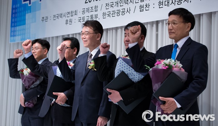 (서울=포커스뉴스) 20일 오후 서울 송파구 교통회관에서 택시 친절 및 교통안전 향상 결의대회에 참석한 강호인(가운데) 국토교통부 장관이 택시 친절왕 수상자들과 기념촬영을 하고 있다.