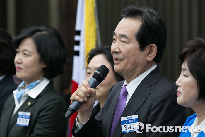 (서울=포커스뉴스) 20일 오전 서울 여의도 국회에서 열린 더불어민주당 20대 총선 당선자 대회에 참석한 정세균 당선인이 인사말을 하고 있다.