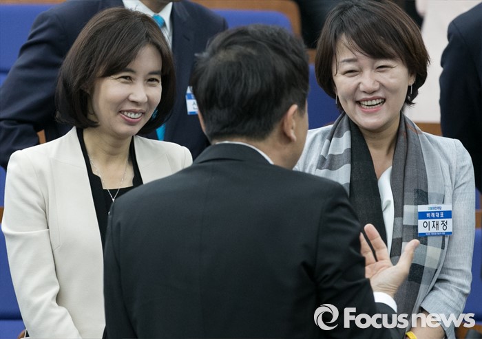 (서울=포커스뉴스) 20일 오전 서울 여의도 국회에서 열린 더불어민주당 20대 총선 당선자 대회에 참석한 이재정(오른쪽), 박경미(왼쪽) 당선인이 동료 당선인들과 대화하고 있다.