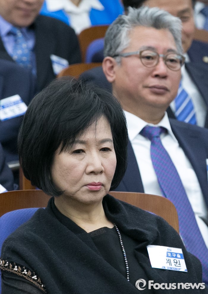 (서울=포커스뉴스) 20일 오전 서울 여의도 국회에서 열린 더불어민주당 20대 총선 당선자 대회에 참석한 손혜원(왼쪽), 조응천 당선인이 김종인 비대위 대표의 인사말을 듣고 있다.