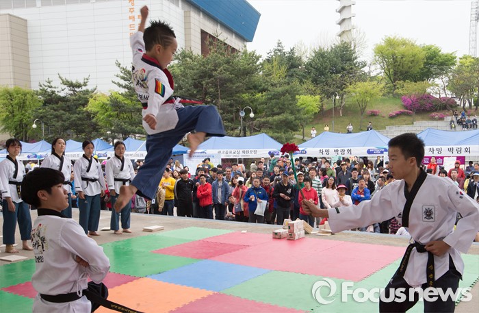 (청주=포커스뉴스) 20일 오후 충북 청주 올림픽국민생활관 일원에서 열린 제36회 장애인의 날 기념행사에서 참가자들이 직지태권도시험단의 시범공연을 관람하고 있다.