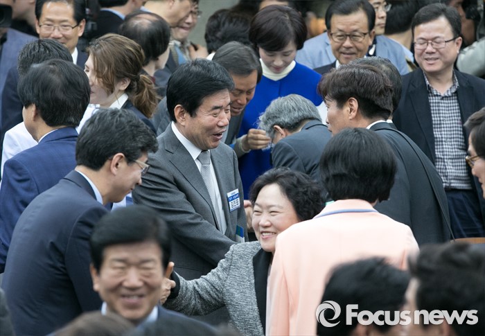 (서울=포커스뉴스) 20일 오전 서울 여의도 국회에서 열린 더불어민주당 20대 총선 당선자 대회에 참석한 김진표 당선인 등이 동료 당선인들과 인사하고 있다.