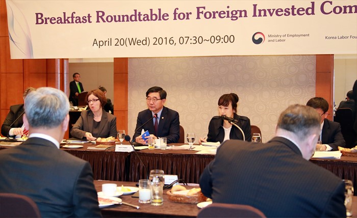 (서울=포커스뉴스) 이기권 고용노동부장관이20일 오전 서울 마포구 서울가든호텔에서 주요외국상공회의소 대표, GM대우, 르노삼성, 맥도날드, 자라리테일, 바스프 등 약 20명의 대표들과 조찬간담회를 갖고 있다.