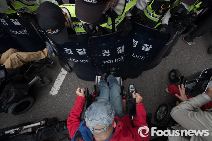 (서울=포커스뉴스) 20일 오후 서울 광화문 광장에서 420장애인차별철폐연대 공동투쟁단 단원들이 '420장애인차별철폐 투쟁결의대회'를 하고 있다.