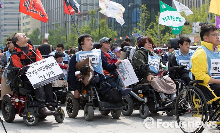 (서울=포커스뉴스) 20일 오후 서울 광화문 광장에서 420장애인차별철폐연대 공동투쟁단 단원들이 '420장애인차별철폐 투쟁결의대회'를 하고 있다.