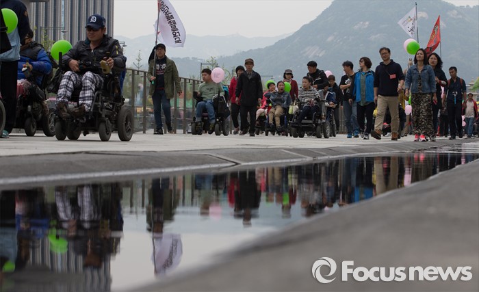 (서울=포커스뉴스) 20일 오후 서울 광화문 광장에서 420장애인차별철폐연대 공동투쟁단 단원들이 '420장애인차별철폐 투쟁결의대회'를 마치고 행진을 하고 있다.