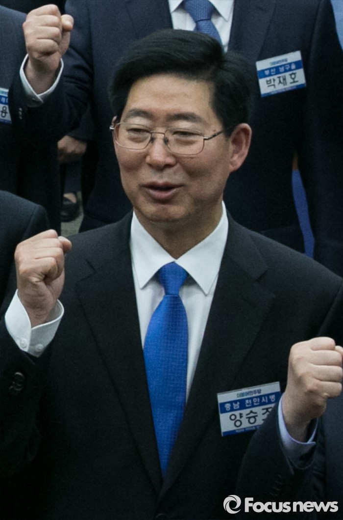 (서울=포커스뉴스) 20일 서울 여의도 국회에서 열린 더불어민주당 20대 총선 당선자 대회에 참석한 양승조 당선인이 구호를 외치고 있다.