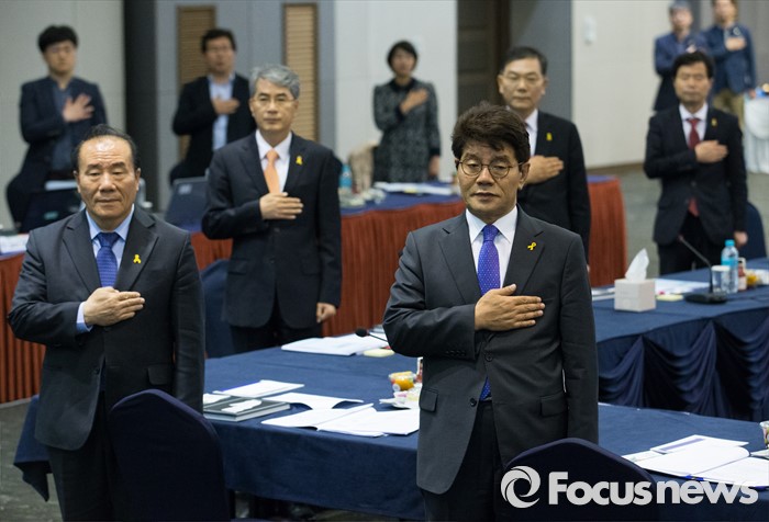 (인천=포커스뉴스) 장휘국 광주시교육감을 비롯한 전국 교육감들이 20일 오후 인천 중구 하버파크호텔에서 열린 전국 시도교육감협의회 간담회에 참석해 국민의례 하고 있다.
