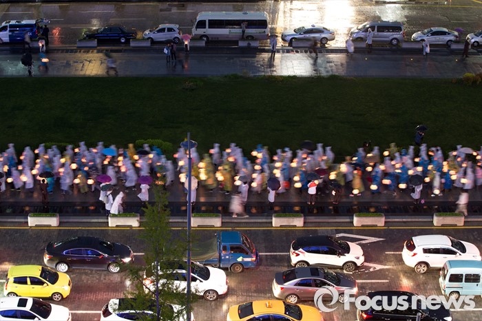 (서울=포커스뉴스) 20일 오후 서울 종로구 광화문 광장에서 부처님오신날(5월 14일)을 앞두고 봉축행사의 일환인 '사사자 삼층석탑등 점등식'이 열리고 있다.