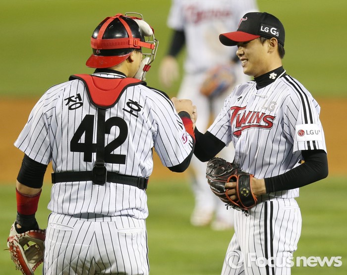 (서울=포커스뉴스) 20일 서울 잠실구장에서 열린 2016 프로야구 NC-LG 경기에서 NC를 6-3으로 물리친 후 LG 포수 정상호(왼쪽)와 세이브를 올린 투수 임정우가 주먹을 마주치며 기뻐하고 있다.