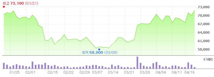 이에 따라 LG생명과학에 대한 목표주가를 종전 8만원에서 8만5000원으로 상향 조정했다.최근 3개월간 LG생명과학 주가 추이 <그래픽출처=네이버>