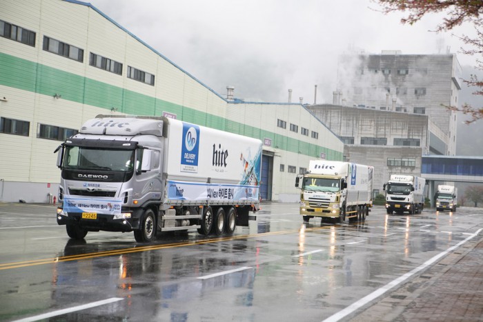 맥아와 호프 등 원료 함량을 조절하고 숙성부터 생산에 이르는 전 공정에 얼음이 얼기 직전 온도인 -3∼-2℃로 유지하는 기술인 엑스트라 콜드 공법을 적용, 최상의 목넘김과 깔끔한 페일라거의 특징을 살린 것이 특징이다.'올뉴하이트'를 실은 차량들이 홍천공장을 빠져나가고 있다.<사진제공=하이트진로>