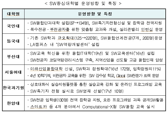 김용수 미래부 정보통신정책실장은 “미래부에서는 SW중심대학을 조기에 확대해 SW중심사회를 이끌어갈 꼭 필요한 SW인재가 적기에 배출될 수 있도록 적극 지원하겠다”고 밝혔다.SW중심대학별 운영방향.<표제공=미래부>