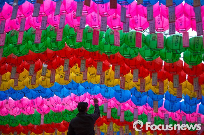 (서울=포커스뉴스) 21일 오전 서울 종로구 조계사에서 열린 관불의식-금박공양 행사장에서 한 조계사 관계자가 부처님 오신날을 대비해 연등에 소원이 적힌 종이들을 달고 있다.