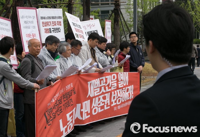 (서울=포커스뉴스) 21일 오전 서울 여의도 전경련회관 앞에서 전경련 관계자가 재벌사내유보금환수운동본부 등 관련단체 회원들의 재벌사내유보금 현황발표 및 환수운동 선포 기자회견을 지켜보고 있다.