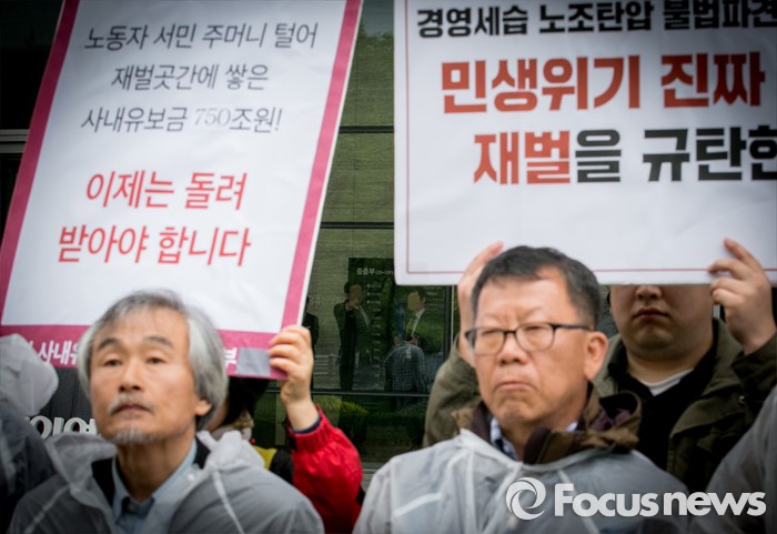 (서울=포커스뉴스) 21일 오전 서울 여의도 전경련회관에서 관계자들이 회관 앞에서 진행 중인 재벌사내유보금환수운동본부 등 관련단체 회원들의 재벌사내유보금 현황발표 및 환수운동 선포 기자회견을 지켜보고 있다.