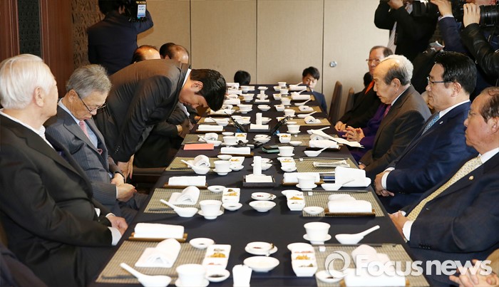 (서울=포커스뉴스) 원유철(왼쪽 세번째) 새누리당 원내대표가 21일 오후 서울 여의도 LG트윈타워의 한 중식당에서 상임고문단 오찬회에 참석해, 허리숙여 인사하고 있다.