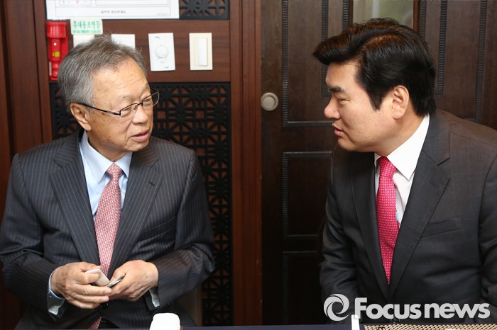 (서울=포커스뉴스) 원유철(오른쪽) 새누리당 원내대표와 박희태 전 국회의장이 21일 오후 서울 여의도 LG트윈타워의 한 중식당에서 상임고문단 오찬회에 참석해 대화하고 있다.