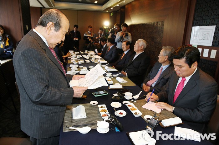 (서울=포커스뉴스) 김수한(왼쪽) 전 국회의장이 21일 오후 서울 영등포구 여의도 LG트윈타워의 한 중식당에서 새누리당 상임고문단 오찬회에 참석해 인사말을 하는 동안, 원유철(오른쪽) 원내대표가 메모하고 있다.
