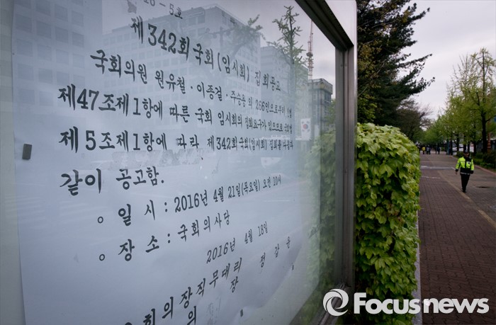 (서울=포커스뉴스) 21일 오후 서울 여의도 국회 앞 게시판에 19대 마지막 임시국회를 알리는 공고가 게시되어 있다.