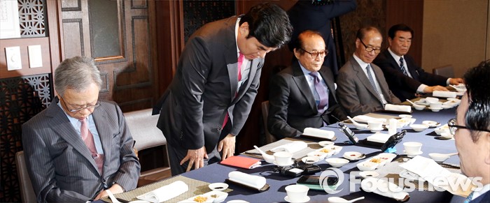 (서울=포커스뉴스) 원유철(왼쪽 세번째) 새누리당 원내대표가 21일 오후 서울 여의도 LG트윈타워의 한 중식당에서 상임고문단 오찬회에 참석해, 허리숙여 인사하고 있다.
