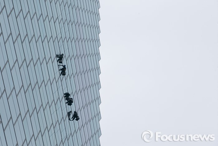 (서울=포커스뉴스) 비가 내린 21일 오전 서울 여의도 전경련회관에서 청소업체 관계자들이 회관 외벽 청소를 하고 있다.