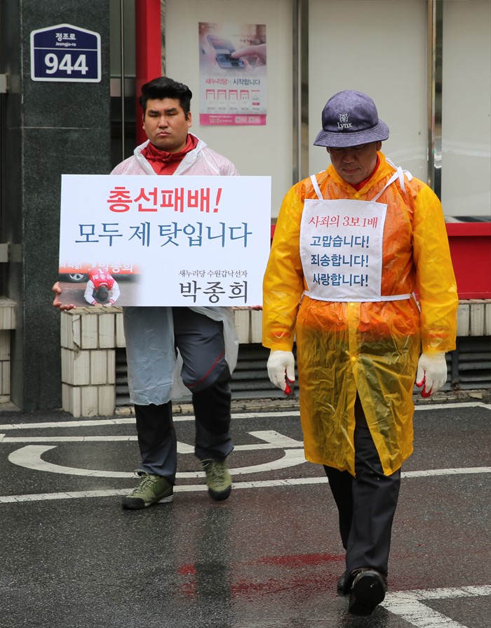 (서울=포커스뉴스) 20대 총선에서 경기 수원갑에 출마했다가 낙선한 박종희 새누리당 제2사무부총장이 21일 오전 경기도 수원 경기도당 사무실에서 사죄의 삼보일배를 하고 있다. <사진제공=박종희 전 의원>