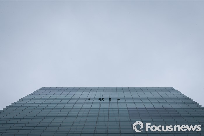 (서울=포커스뉴스) 비가 내린 21일 오전 서울 여의도 전경련회관에서 청소업체 관계자들이 회관 외벽 청소를 하고 있다.
