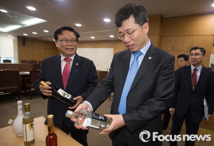 (세종=포커스뉴스) 이동필 농림축산식품부장관이 21일 오전 세종시 종부세종청사 농식품부 대회의실에서 나라장터 종합쇼핑몰의 전통주 판매 활성화를 지원하기 위한 업무협약을 체결하고 전통주에 대해 정양호 조달청장에게 설명하고 있다.