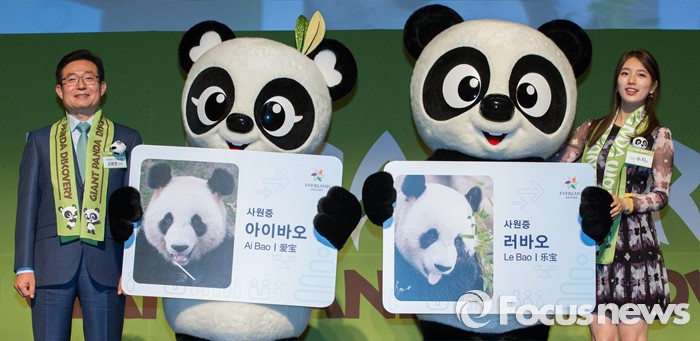 (용인=포커스뉴스) 21일 오전 경기도 용인시 에버랜드에서 열린 '판다월드 개관식'에서 김봉영 삼성물산 대표이사 사장과 미쓰에이 수지가 아이바오, 러바오 팬더 캐릭터 인형들과 기념촬영을 하고 있다.
