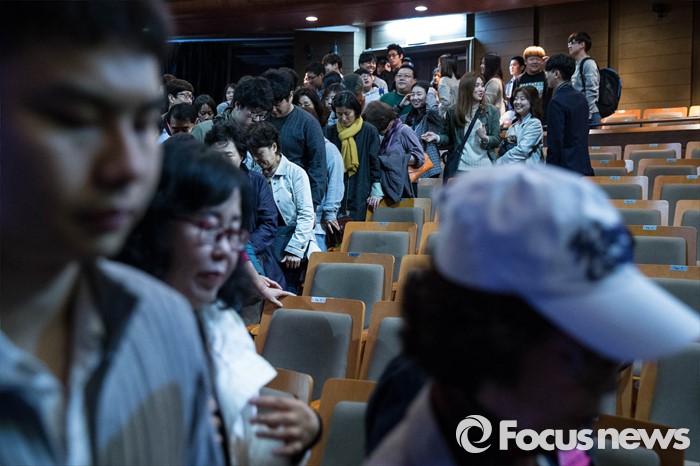 (서울=포커스뉴스) 21일 오후 서울 중구 명동예술극장에서 열린 '대테러훈련'에 참석한 일반 관객들이 대피훈련을 하고 있다.