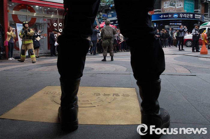(서울=포커스뉴스) 21일 오후 서울 중구 명동예술극장에서 경찰특공대, 중부소방서, 218연대 등이 공연장 대테러훈련을 실시하고 있다.